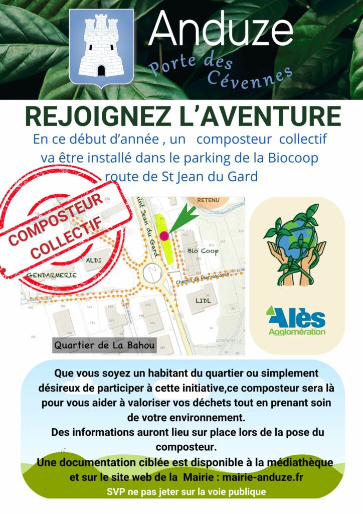 Deux autres composteurs publics ont été installés depuis, route de Saint-Félix (parking entre café des Arts et rue Beauregard) et route de Saint-Jean-du-Gard (face à la Biocoop)(mise en service en février pour ce dernier)