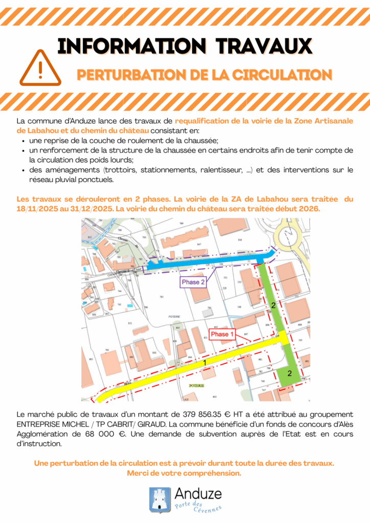 A partir du 18 novembre, la voirie de la zone artisanale de Labahou et du chemin du château entre en travaux de requalification (détails sur l’affiche).