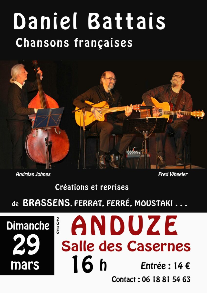Daniel Battais, accompagné par Fred Wheeler à la guitare, Andréas Johnes à la contrebasse vous propose des compositions et des reprises de Brassens , Ferré , Ferrat , Moustaki , etc… Poésie , Nostalgie et Humour !