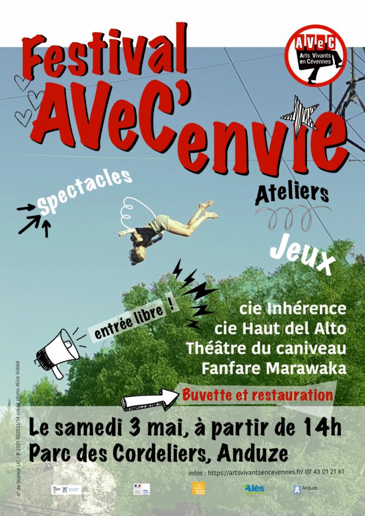Un festival pluridisciplinaire avec une programmation riche et diversifiée dans le parc des Cordeliers d’Anduze. Au programme, des ateliers, animations, déambulations, spectacles… avec des artistes reconnus, des créations et des performances in situ… le tout en accès libre et AVeC’envie !