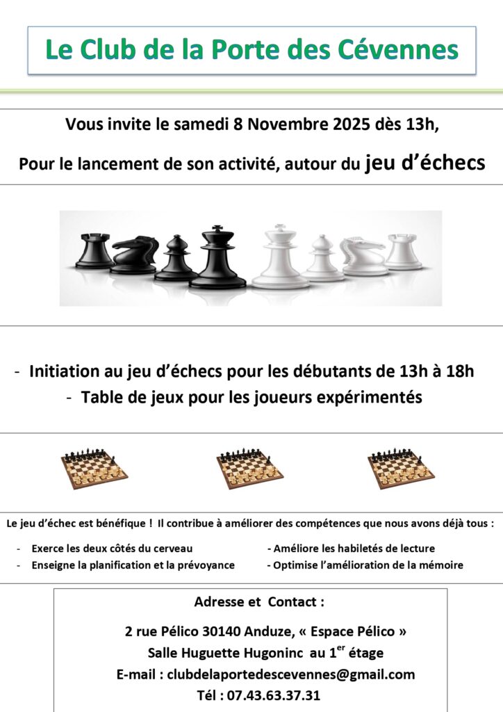 Nouvelle activité Jeux d’Échecs (Club de la Porte des Cévennes)