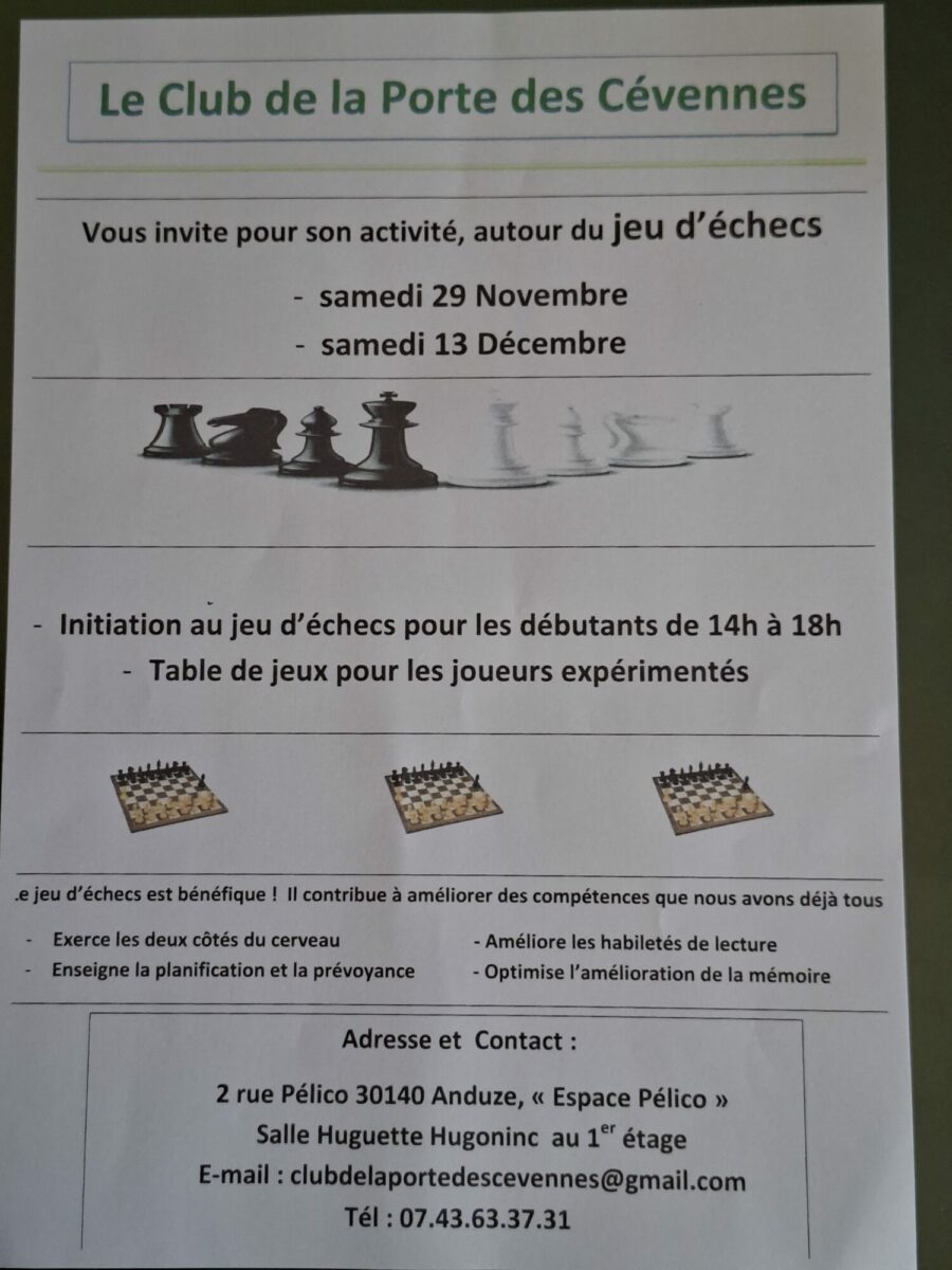 Jordan MATTIS invite les joueurs d’échecs, débutants ou confirmés à jouer les samedis 29 novembre et 13 décembre de 14h à 18h salle Huguette Hugoninc au 1er étage de l’Espace Pélico. Pour tout renseignement Tel : 06 24 24 90 18 ou 06 61 09 09 55 ou 07 43 63 37 31