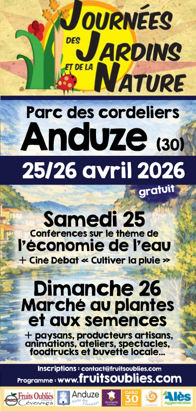 Le Samedi 25 et Dimanche 26 Avril c’est le retour des journées des plantes et de la nature à Anduze, au Parc des Cordeliers, organisées par l’association « Fruits Oubliés ».