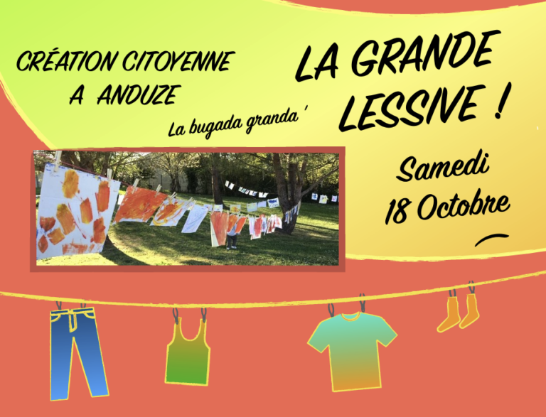 LA GRANDE LESSIVE est une installation artistique éphémère internationale, conçue à partir d’une invitation collective, avant d’être suspendue en extérieur à des fils tendus à travers cours, places et rues, au moyen de pinces à linge… A ANDUZE LE SAMEDI 18 OCTOBRE ! Programme ci-dessous
