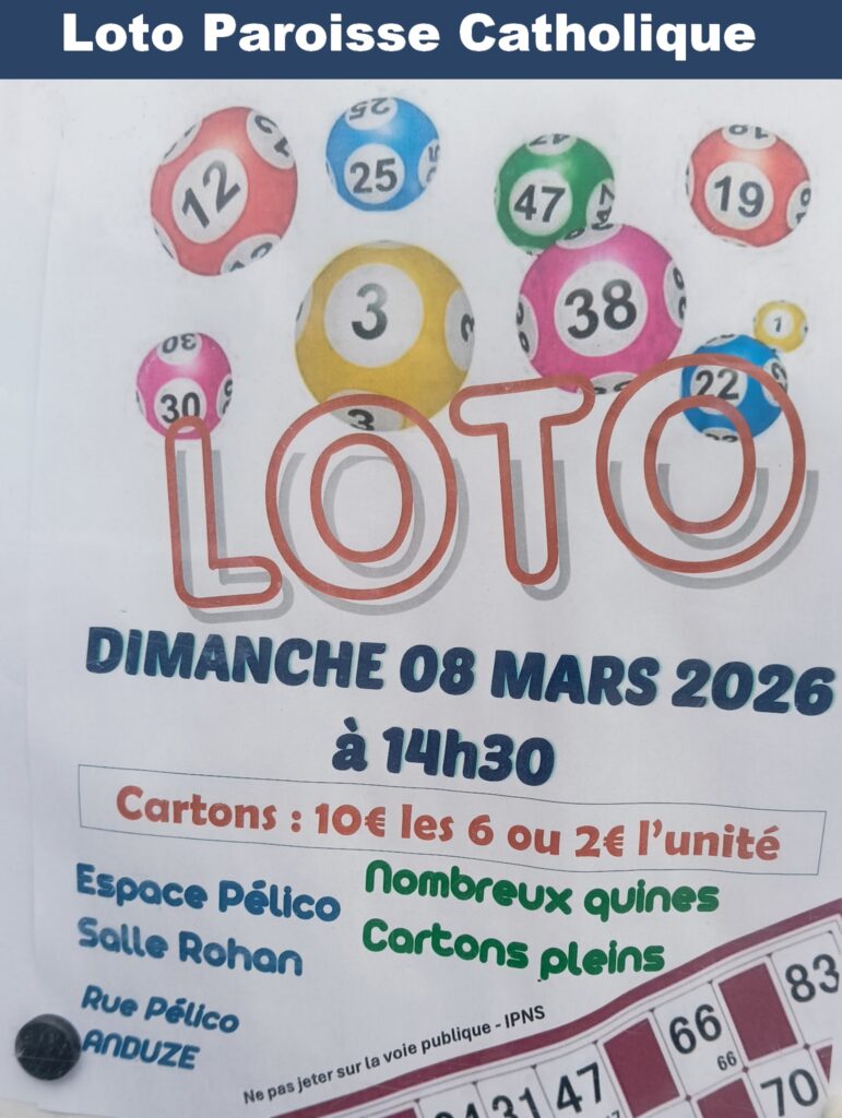 La Paroisse catholique organise un loto dimanche 8 mars de 14h à 17h Salle Rohan.