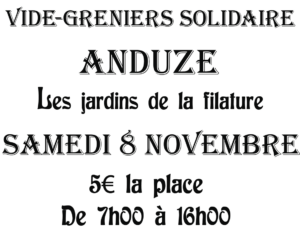 ![]() Commémoration du 11 novembre 1918 à Anduze : 11h30, devant la mairie, départ du défilé vers le monument, parc des Cordeliers. A l'occasion de la commémoration de l'armistice du 11 novembre 1918, la vente de "bleuets de France" vous sera proposée à partir de 11h30 depuis la Mairie, Plan de Brie, jusqu'au monument commémoratif, Parc […] |