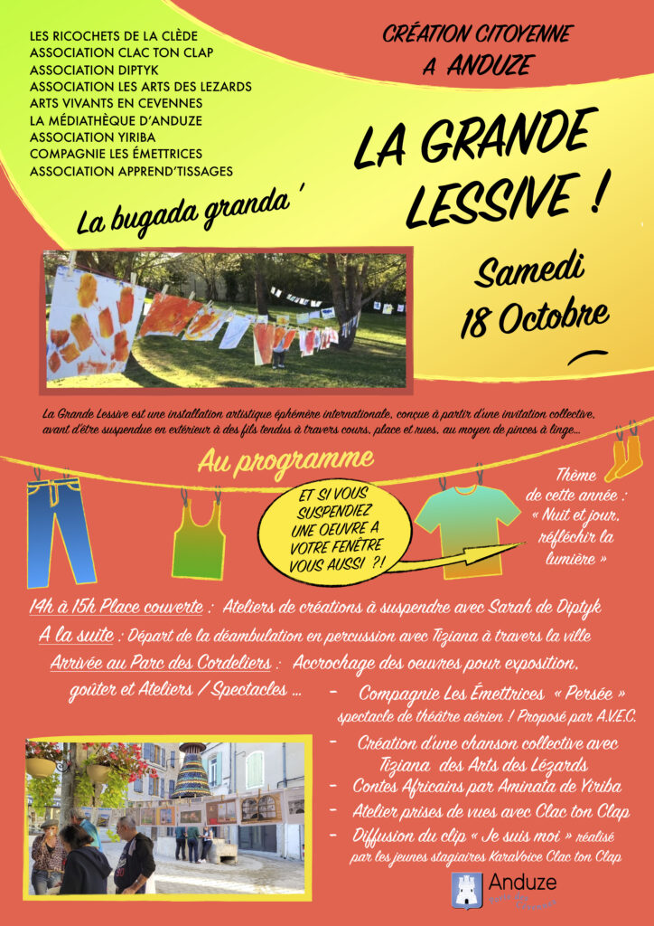 LA GRANDE LESSIVE est une installation artistique éphémère internationale, conçue à partir d’une invitation collective, avant d’être suspendue en extérieur à des fils tendus à travers cours, places et rues, au moyen de pinces à linge… A ANDUZE LE SAMEDI 18 OCTOBRE ! Avec la participation de nombreuses associations locales. Programme ci-dessous