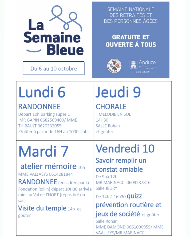 Une semaine qui valorise la place des séniors dans notre société. Au programme : Randonnées, chorale, atelier “mémoire” ou encore “savoir remplir un constat amiable d’accident”… Pour plus d’information, voir l’affiche ci-dessous.