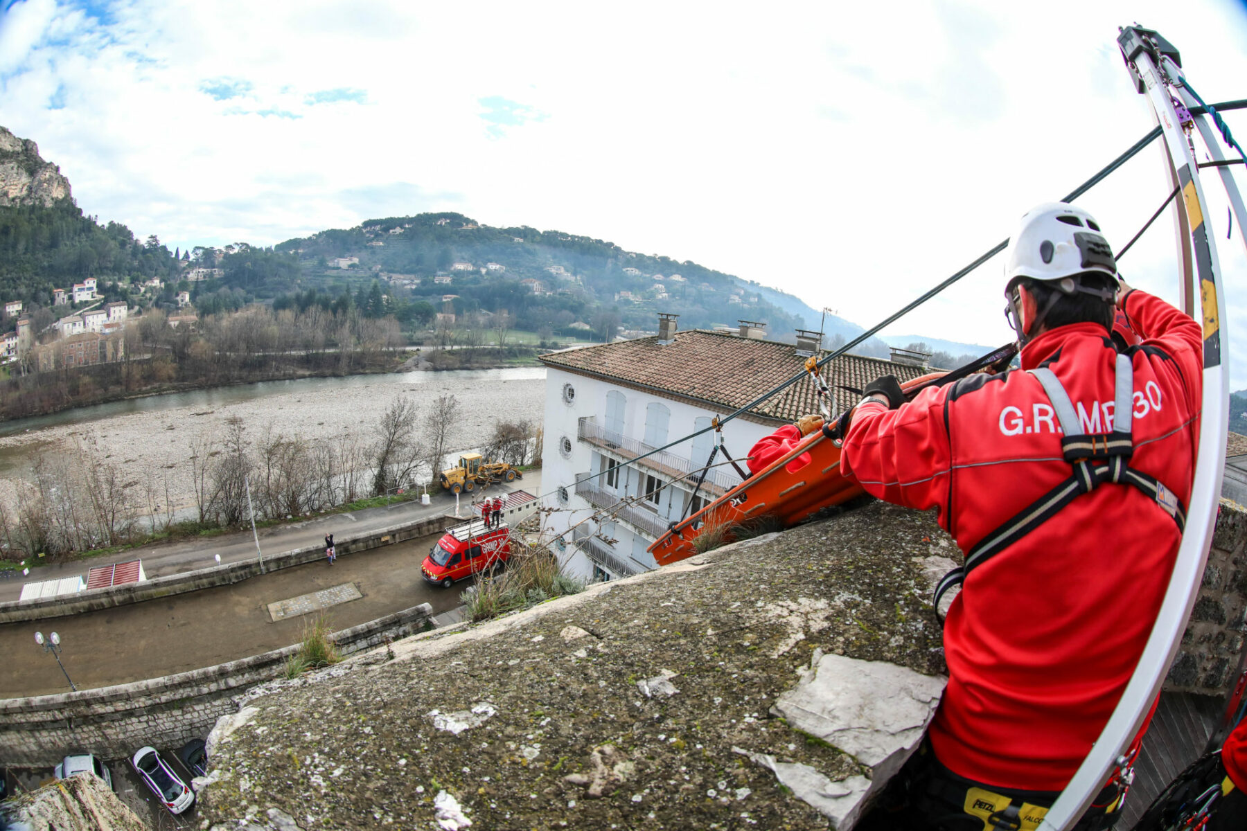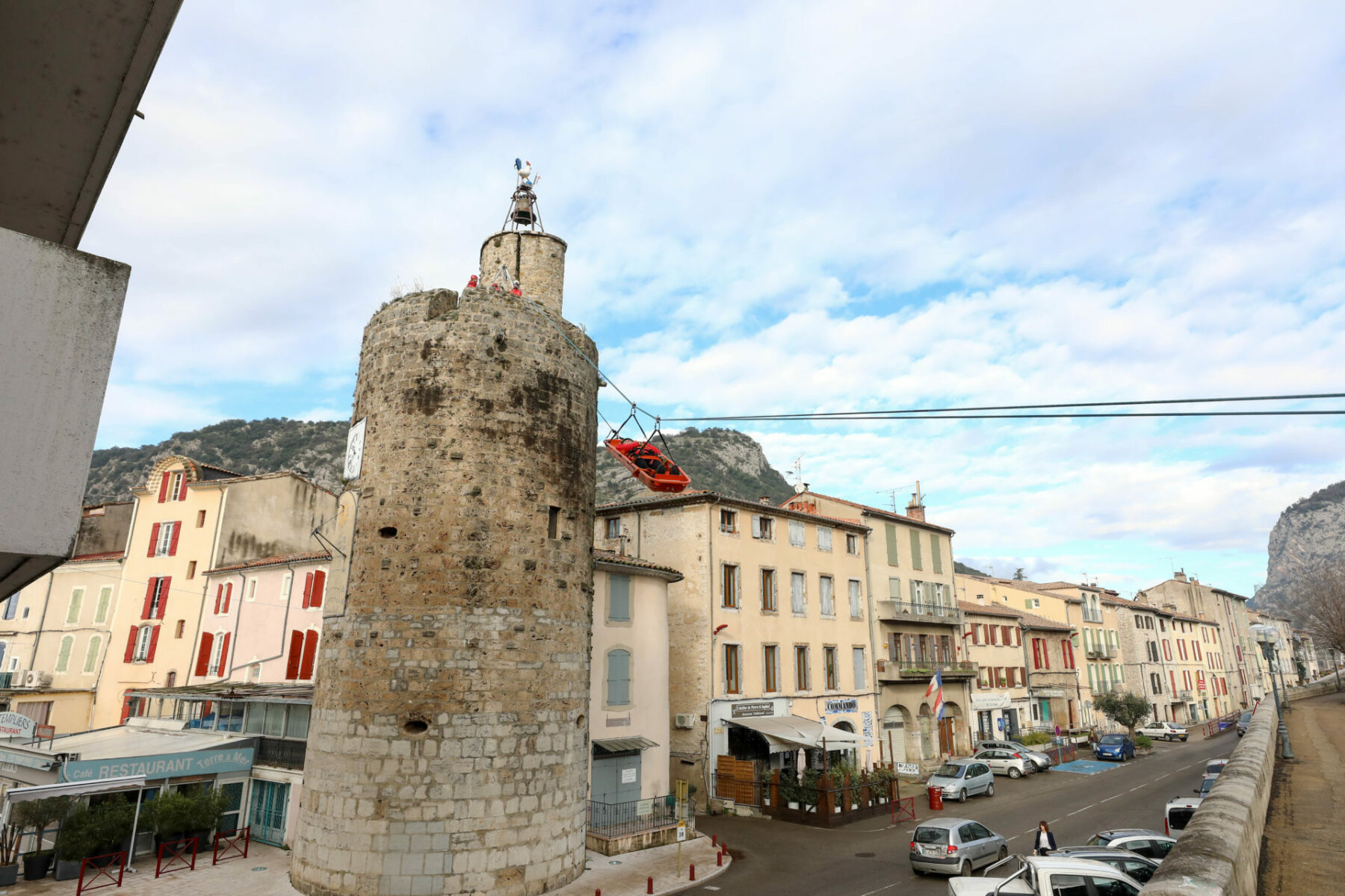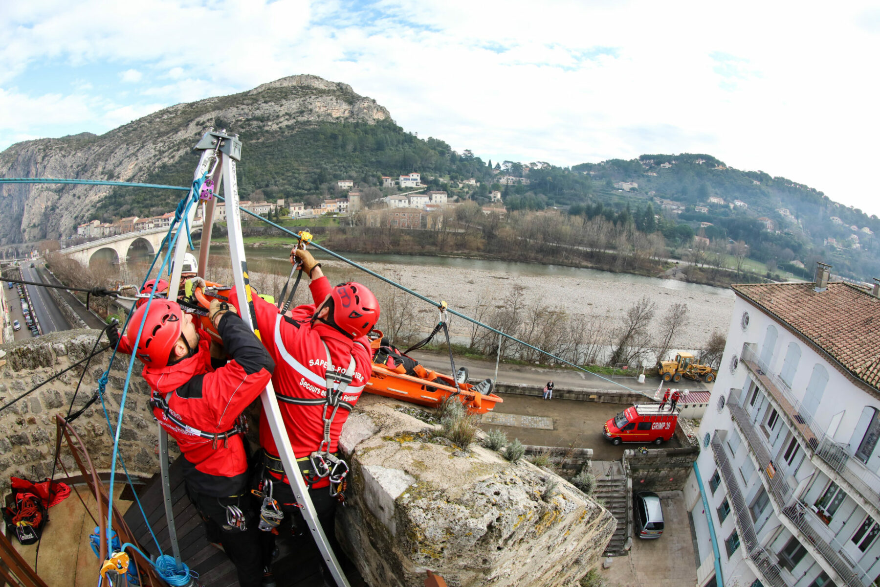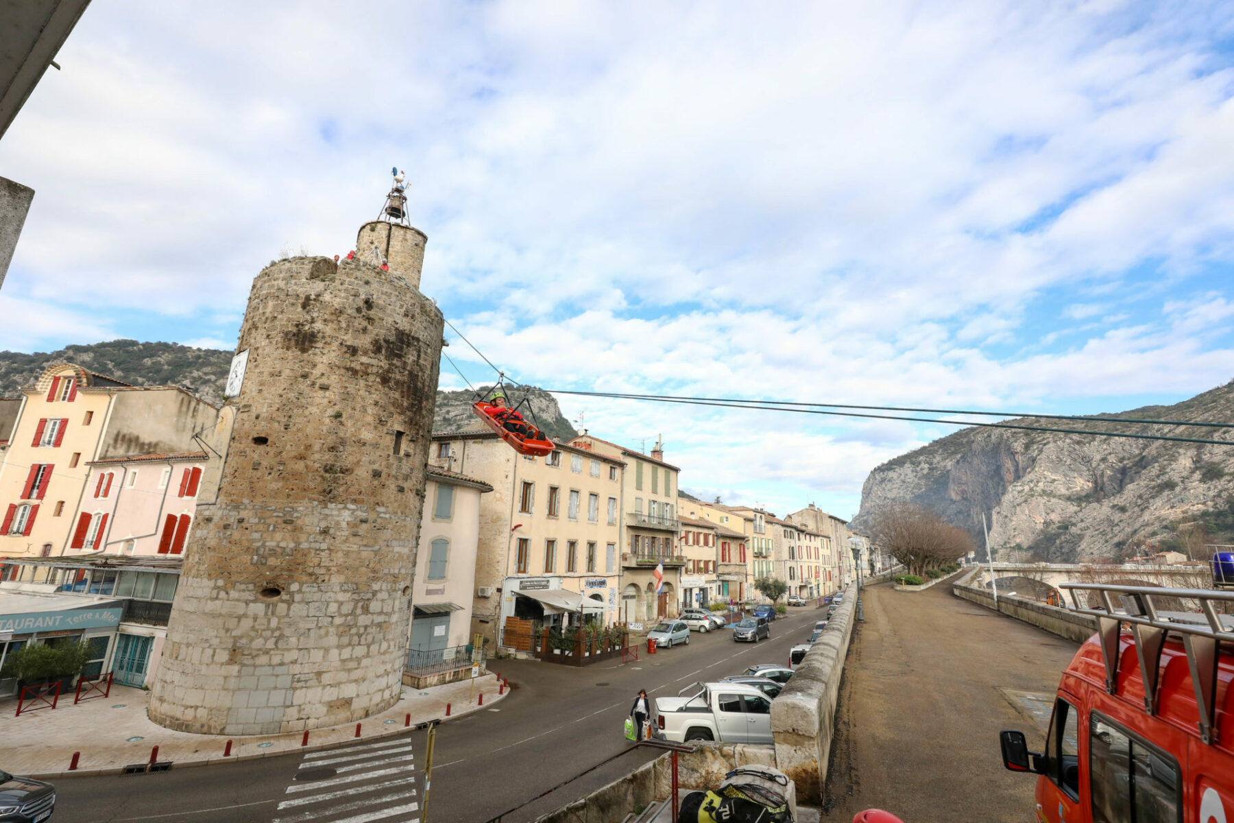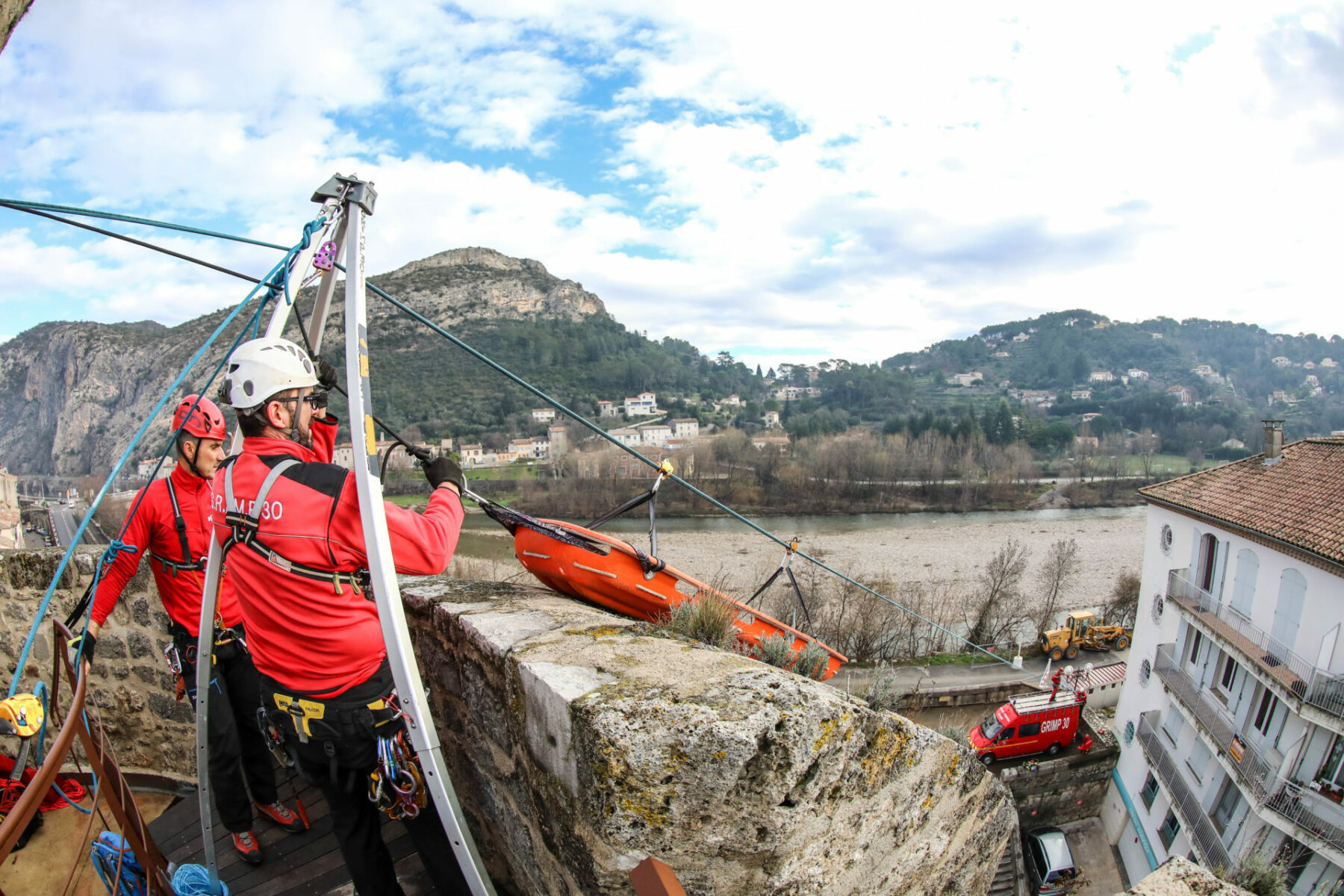 Pour le lieu particulier de la terrasse, deux anneaux spécifiques ont été scellés sur l’édicule en pierre qui supporte la cloche. Cela permet aux pompiers de fixer en toute sécurité leur matériel pour la descente d’une civière jusqu’au niveau du quai.