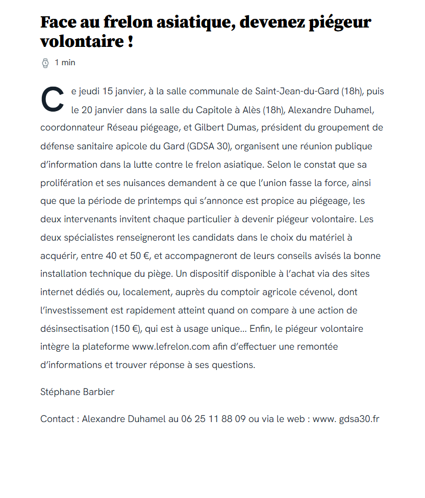 Ce jeudi 15 janvier, à la salle communale de Saint-Jean-du-Gard (18h), et mardi 20 janvier dans la salle du Capitole à Alès (18h), Alexandre Duhamel, coordonnateur Réseau piégeage, et Gilbert Dumas, président du groupement de défense sanitaire apicole du Gard (GDSA 30), organisent une réunion publique d’information dans la lutte contre le frelon asiatique.