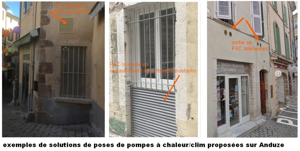 Des solutions alternatives sont le plus souvent possibles: appareils de nouvelle génération sans unité extérieure (seuls deux percements en façade de faible diamètre sont nécessaires), encastrement dan l’épaisseur de la façade avec mise en discrétion, pose en courettes, en sous sol ou combles perdus , etc… L’ABF et le représentant de la ville vous aideront à trouver une solution acceptable plutôt que de risquer une dépose d’appareils posés de manière non conforme.